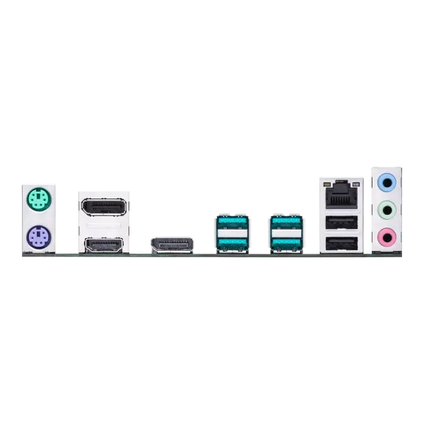 4 x USB 3.2 Gen 2 ports (4 x Type-A) 2x USB 2.0 ports (2 x Type-A) 2 x DisplayPort 1 x HDMITM 3 x Audio jacks 1 x Intel® I219-LM 1Gb Ethernet 1 x PS/2 keyboard (purple) port 1 x PS/2 mouse (green) port |