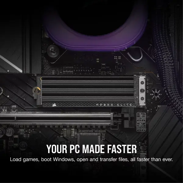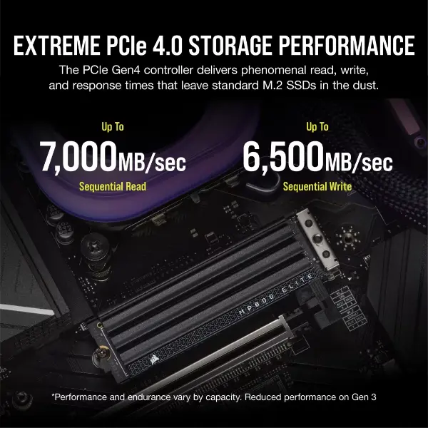 The CORSAIR MP600 ELITE provides PC-boosting PCIe 4.0 storage performance capable of reaching sequential read speeds of up to 7,000MB/sec and writes of up to 6,500MB/sec.